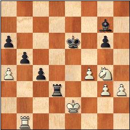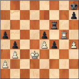 Las negras tienen un peón de más pasado y protegido, pero la torre blanca es muy efectiva, atacando el peón e y cortando al rey enemigo. 40.Txe5?? Ahora para detener el peón habrá que pasar a un final de peones perdido. [40.Rd2! ¡La amenaza es más fuerte que la ejecución! Al acercar el rey a la casilla de coronación del peón las negras no pueden avanzarlo y se ven obligadas a defender su peón e: 40...Te6 41.Re2 Espera. 41...h6 42.Tf5 Y las negras, con el rey cortado y la torre atada, no pueden progresar.] 40...f3 El propio peón impide que el monarca se aproxime a f1. 41.Tf5 Txf5 42.exf5 Rg7 43.Re3 Rf6 44.Rxf3 Rxf5 45.Rg3 h6! Cede un tiempo. 46.Rf3 h5 Teniendo la oposición el rey negro pasará la línea de los peones. 47.Re3 Rg4 48.Re4 Rxh4 49.Rf4 Rh3 0-1